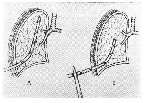 Для предупреждения ближайших и отдаленных осложнений при вмешательствах на легких решающее значение имеет рациональный уход за плевральной полостью. Эвакуация из плевральной полости через дренаж экстравазата и воздуха способствует ликвидации операционного пневмоторакса, расправлению оставшейся части легкого после частичной резекции, что является действенной мерой для предупреждения нарушений дыхания, развития остаточных полостей, бронхиальных свищей и плевральных эмпием. Для дренирования плевральной полости после внутригрудных вмешательств вводят тонкие резиновые трубки в верхний и нижний отделы плевральной полости (апикальный и наддиафрагмальный дренаж) или один широкий длинный дренаж с множественными боковыми отверстиями в нижний отдел плевральной полости, укладывая его по боковой или задней грудной стенке до плеврального купола; иногда дистальный конец такого дренажа фиксируют отдельным швом к париетальной плевре. О преимуществах широкого перфорированного дренажа сообщают в последнее время Л. Е. Сефрановский (1965), Г. Т. Марченко (1966).