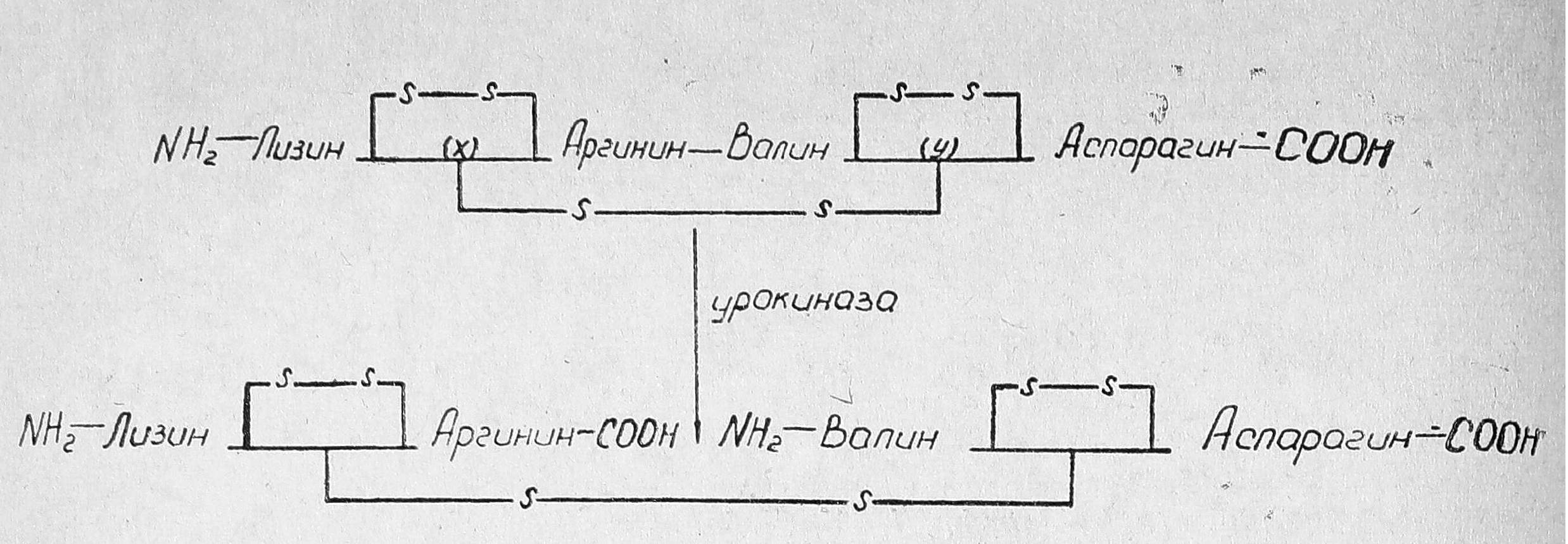 Активация плазминогена урокиназой является ферментативной реакцией с оптимумом pH 9. Урокиназа является протеолитическим ферментом, способным расщеплять связи аргинин — валин [4, 29, 30]. Она гидролизует эфиры аргинина, на этом свойстве основан метод измерения активности, позволяющий определить урокиназу в единицах СТА (Комитет по тромболитическим агентам). В действии урокиназы на плазминоген не отмечается высокой видовой специфичности. Урокиназа человека способна активировать плазминоген большинства видов млекопитающих [8, 20, 32]. Установлена лишь видовая специфичность урокиназы морских свинок, которая с хорошо воспроизводимым результатом активирует только плазминоген морских свинок [18, 27]. Активация плазминогена в присутствии урокиназы обусловлена расщеплением связи аргинин — валин, что ведет к возникновению молекул, образованных из двух полипептидных цепей, связанных между собой дисульфидным мостиком (см. схему). Этот механизм объясняет, почему плазминоген и плазмин имеют один и тот же аминокислотный состав и иммунологическую идентичность. Стрептокиназа также осуществляет гидролиз избирательно на уровне связи аргинин — валин. То же самое происходит и под действием других факторов. Молекула плазмина получается одинаковой, независимо от вида активатора [33].
