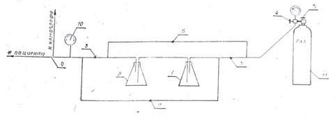 Схема аппарата для пертубаций и создания пневмоперитонеума: 1, 2 — колбы от аппарата Боброва; 3 — вентиль газового баллона; 4 — вентиль редуктора; 5, 6, 7, 8— палуоборотные краны; 9—выходная трубка аппарата; 10—манометр; 11 — баллон с газом.