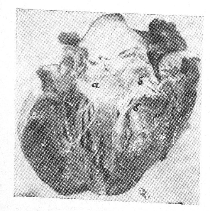 2. Figure: 1. Macrodrug of the heart. The left ventricle is deployed. Subortal endocardial duplication (a), passing to the mitral valve leaflet (b). Shortening of the chordae of the anterior cusp of the mitral valve (c).