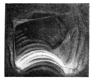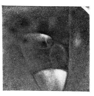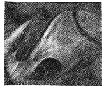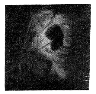 - Трансиллюминация позволяет распознавать патологию стенок бронхов с эндобронхиальной и интрамуральной локализацией, недоступную для выявления в отраженном свете. Установлено, что некоторые патологические фокусы стенки бронха (гематомы, инфильтраты, опухолевая ткань) обладают способностью задерживать лучи видимого света и создавать затенения на фоне светового потока, исходящего из бронха, другие, наоборот, образуют участки повышенной прозрачности (дефекты слизистой, хрящевых колец, ожоги). В эксперименте были моделированы патологические процессы и детально изучены трансиллюминационные картины при них. В части опытов картины в проходящем свете изучались в динамике. На рис. 9 представлена трансиллюминационная картина депо туши, созданного в подслизистом слое шейного отдела трахеи собаки. В отраженном свете со стороны наружной стенки трахеи определить место скопления туши не представлялось возможным.
