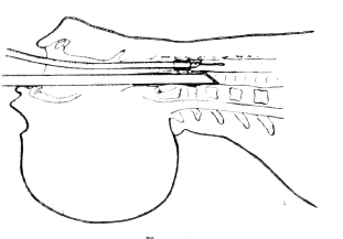 Рис. 9. Депо туши под слизистым слоем трахеи. Трансиллюминационная картина. Опыт на собаке.
