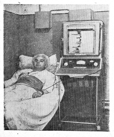 Рис.2 Больной С., исследуемый с помощью радиотелеметрической системы. Справа от больного — приемно-анализирующее и регистрирующее устройство.