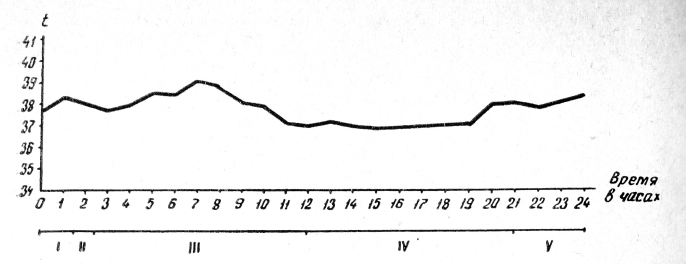 Рис.3 Кривая температуры в желудочно-кишечном тракте у К. Обозначения: I — желудок; II—двенадцатиперстная кишка; III—тонкий кишечник; IV — толстый кишечник; V — прямая кишка.