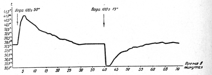 Кроме того, были проведены отдельные наблюдения для выяснения характера изменения температуры в желудке при наложении на эпигастральную область грелки или пузыря со льдом. Для увеличения времени наблюдения радиокапсулу в желудке удерживали с помощью шелковой нити. Грелку или пузырь со льдом клали на эпигастральную область на 30 мин. Температура между грелкой и передней брюшной стенкой была в пределах 41°, между пузырем со льдом и передней брюшной стенкой — d пределах 25°. Однако никаких изменений температуры в желудке в течение 2 часов после действия тепла или холода не было зарегистрировано.
