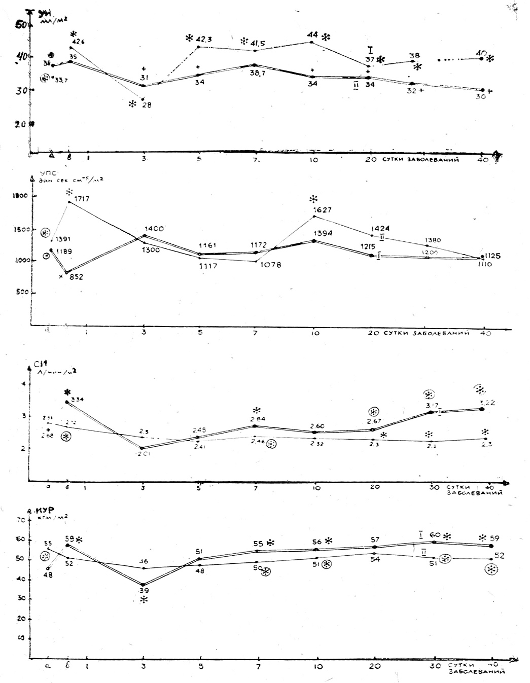 На 3-и сутки заболевания эти показатели снижались, однако через 5—7 сут вновь увеличивались с максимальным подъемом на 7-е сутки и с дальнейшей стабилизацией вплоть до 30 сут наблюдения. Удельное периферическое сопротивление снижалось на фоне применения аминокислотных препаратов в 1-й день заболевания, значительно повышалось к 5-м суткам, затем возвращалось к исходным показателям на протяжении всего 30-дневного наблюдения. В контрольной группе гемодинамические показатели также понижались в 1—5-е . сутки заболевания с минимальным значением к 3-му дню, после чего имели нерезко выраженную тенденцию к повышению. Изменения удельного периферического сопротивления носили волнообразный характер (рис.).