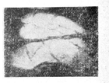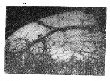 На рис. 1 представлена трансиллюминационная ангиограмма желчного пузыря. Она включает сосуды субсерозного, подслизистого слоя и сосуды слизистой. Эти сете наслаиваются. Однако возможна их дифференцировка по особенностям ангиоархи тектоники каждого из сплетений, а также по отличию контрастности теневых изображений.