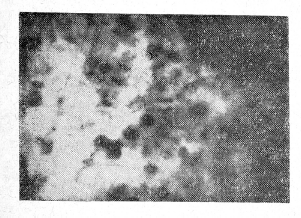 О воспалении стенки пузыря судят по виду серозного покрова, а также по изменениям консистенции стенки пузыря. При выраженных холециститах диагноз не представляет трудностей. Мы располагаем наблюдениями, когда серозный покров пузыря и протоков был без каких-либо особенностей, пальпаторно также не обнаруживались отклонения, вместе с тем при просвечивании выявлялись теневые фокусы соответственно воспалительным или рубцовым изменениям, деструктивным очагам стенки пузыря. На рис. 5 дана трансиллюминационная картина очагового рубцового поражения общего желчного и пузырного протока. При этом ни при осмотре в отраженном свете, ни пальпаторно нельзя было выявить патологию. На рис. 6 показаны также обнаруженные лишь при просвечивании рубцовые изменения стенки пузыря, на рис. 7 — множественные некротические очаги при остром холецистите.