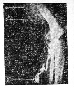 Со слоновостью нижних конечностей было 2 больных. Внутрикостная флебография произведена у них для выяснения проходимости глубоких вен перед иссечением патологически измененной кожи, подкожножировой клетчатки и апоневроза с последующим закрытием образовавшегося дефекта с помощью кожной пластики. Поверхность глубоких вен у больных была сохранена, одной больной сделана операция, вторая от операции отказалась