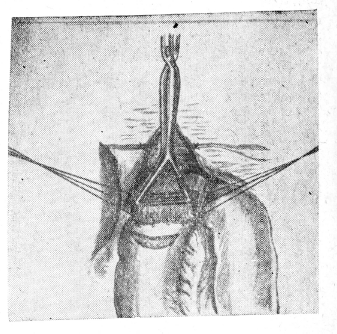 Рис.1 Абдоминальный отрезок пищевода прошит двумя рядами танталовых швов и пересечен между ними.