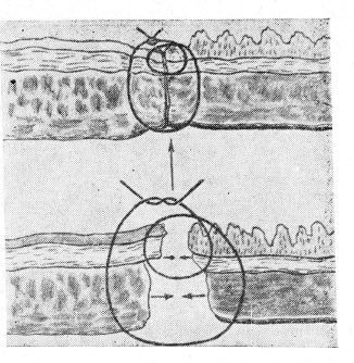 Во время формирования анастомоза мы обращаем особое внимание на тщательное сопоставление всех слоев стенок сшиваемых органов, герметичность шва и минимальное нарушение кровообращения после наложения швов. Это достигается применением предлагаемого адаптирующего шва, являющегося модификацией сквозного краевого узловатого шва. Сопоставление слоев сшиваемых органов осуществляется двумя стежками внутриузелкового шва. Один стежок такого шва при вколе со стороны слизистой проходит через все слои пищевода и кишки или желудка, второй на том же уровне захватывает слизистую с подслизистым слоем. В результате затягивания такого шва мышечный слой пищевода плотно и точно сопоставляется с серозно-мышечным слоем кишки или желудка Слизистая с подслизистым слоем пищевода и кишки (желудка) также приходит в плотное соприкосновение, расхождения слизистых не наблюдается. Узел мы завязываем со стороны просвета сшиваемых органов. Возможен и обратный порядок наложения шва: сначала прошивают слизистую с подслизистым слоем, а затем нить проводят через все слои (рис. 3). Значительная механическая прочность сформированного анастомоза достигается двойным прошиванием наиболее прочного подслизистого слоя и проведением нити через все слои каждым швом. Точно сопоставить слои сшиваемых органов удается при затягивании такого шва и тогда, когда после пересечения слизистая с подслизистым слоем пищевода сокращаются и уходят значительно выше линии пересечения мышечного слоя (рис. 4). После наложения 5—6 таких швов на заднюю полуокружность формируемого анастомоза переднюю часть пищевода отсекаем вместе с танталовым швом на том же уровне и так же двухмоментно. Переднюю стенку анастомоза создаем такими же адаптирующими внутриузелковыми швами (рис. 5).