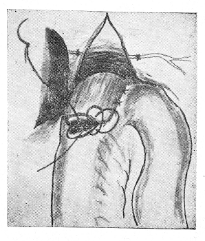 Мы хогим поделиться своим небольшим (25 больных) опытом усовершенствования оперативной техники, которое позволяет облегчить операцию, получить более надежный пищеводно-кишечный или пищеводно-желудочный анастомоз. Не останавливаясь подробно на общепринятых стандартных этапах операции, мы опишем только ряд деталей техники, применяемых нами. Отсечение желудка от двенадцатиперстной кишки или пересечение его тела при резекции верхнего отдела производим после решения вопроса об операбильности, что окончательно выясняется после перевязки и пересечения левой желудочной артерии и мобилизации проксимального отдела желудка. Культю двенадцатиперстной кишки или желудок прошиваем аппаратами УКЛ-40 или УКЛ-60, погружаем двумя полукисетными шелковыми швами в области углов и отдельными узловатыми шелковыми швами между ними. Наиболее ответственным этапом операции является формирование пищеводно-кишечного или пищеводно-желудочного соустья. Недостаточность швов анастомоза в большинстве случаев является смертельным осложнением, так как его обычно диагностируют поздно, когда появляются симптомы разлитого перитонита. Наряду с применением при резекции пищевода и гастрэктомии механического танталового шва, накладываемого аппаратом ПКС-60, мы считаем необходимым дальнейшее совершенствование ручного шва при наложении пищеводно-кишечного и пищеводно-желудочного соустий, так как нередко встречаются изменения в анастомозируемых органах, при которых наложение аппаратного шва противопоказано.