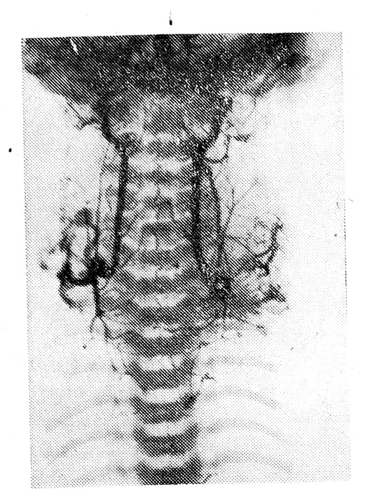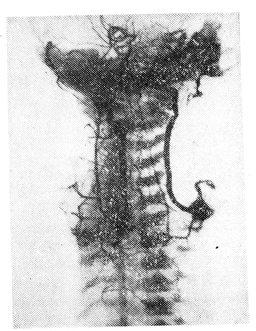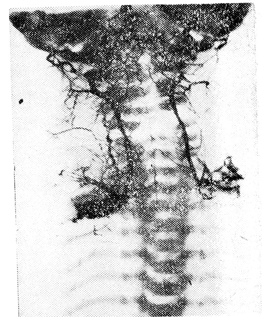 Рис. 3. Посмертная вертебральная ангиограмма новорожденной Е. в прямой проекции. На уровне С4—С5 с обеих сторон отмечается циркулярное сужение просвета позвоночных артерий. Перерыв проходимости передней спинальной артерии со смещением корешковых артерий.