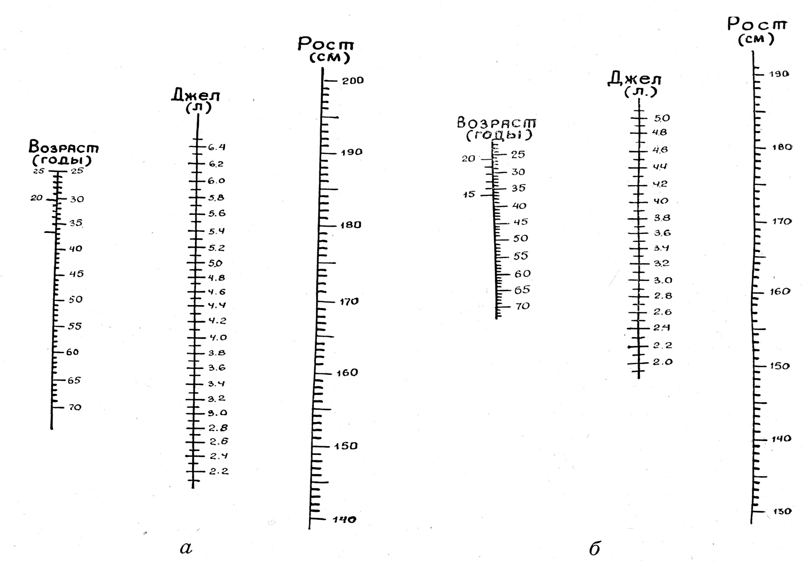 Рис. 1. Номограммы для определения должной жизненной емкости легких (ДЖЕЯ); а — у мужчин, б — у женщин.