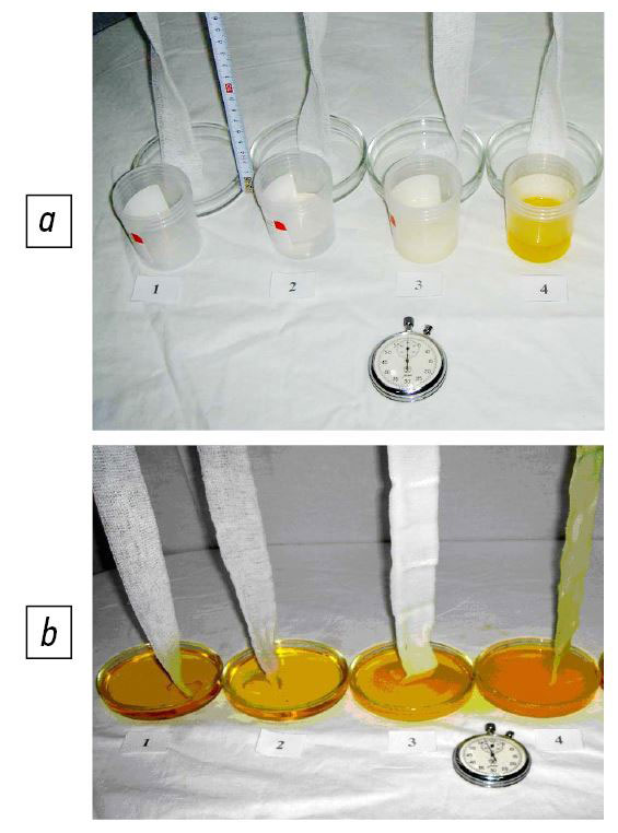 Fig. 1. а. General view of laboratory materials used in the experiment to assess the osmotic activity of ointment compositions. Gauze strips are fixed to the tripod at an equal height. Explanations in the text. b. Experiment to evaluate the osmotic activity of ointment compositions. The edge of the gauze strip is immersed in a contrast agent of 0.3% K2Сr2О7; 1 — dry cloth; 2 — hypertonic NaCl solution; 3 — levosmekol ointment; 4 — levoxycol ointment. Explanations in the text