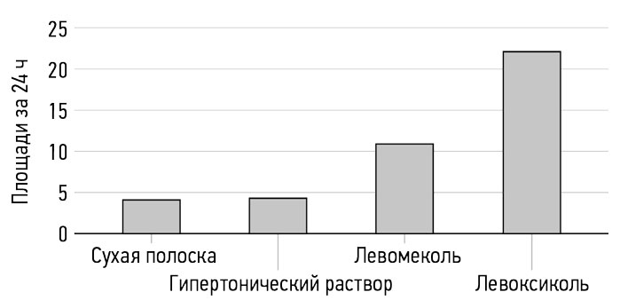 The osmotic activity of the experimental ointment composition, Levoxycol, in comparison with the known drug, was evaluated in an in vitro experiment using the method described by Y.K. Abaev (2005) [11]. The tested ointment composition in the amount of 40 g was heated in a thermostat to a liquid consistency, maintaining an ointment temperature of 35°C–36°C. A gauze strip, 35 mm wide and 700 mm long, was placed into the studied liquid ointment and soaked for 30 min.