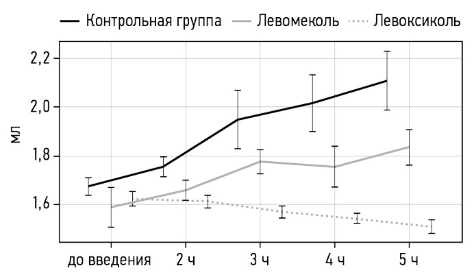 RESULTS: Osmotic activity showed that wipes soaked in ointment forms absorbed the following amount of contrast (Me [Q1; Q3]): levomekol — 28.2 (26.4; 31.3) ml; levoxycol — 41.8 (39.5; 43.4) ml (p=0.001). The anti-inflammatory activity of the ointment forms manifested itself in the form of suppression of swelling of the rats' paws at 3 and 5 hours after the injection of carrageenan. When using the ointment form of levomekol, the volume of displaced liquid with the introduction of carrageenan, starting from 3 hours, was 1.8±0.19 ml. When using the ointment form of levoxicol, the amount of displaced liquid when carrageenan was administered, starting from 3 hours, was 1.57±0.16 ml (p=0.013).