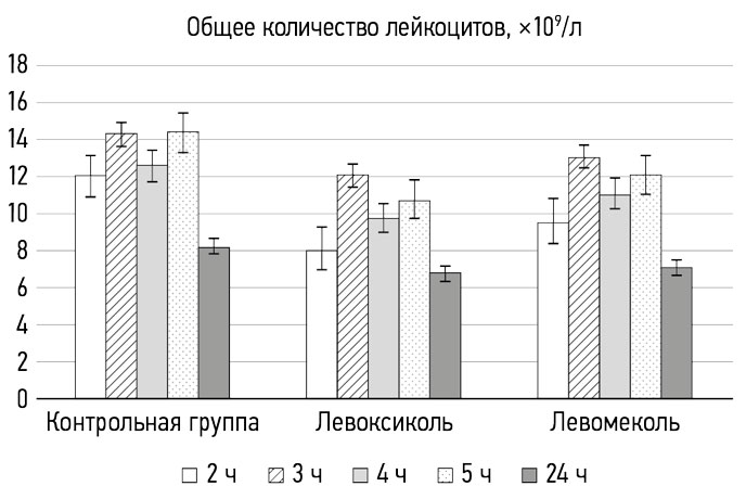 As a result of modeling inflammation, an increase in the white blood count by three times was registered in the control group after just 2 hours, with the peak (15 ± 1.3 × 109/L) occurring at 5 hours (Fig. 5). In the group where Levomecol was used, a significant increase in the white blood cell count occurred with a delay compared to the control group, approximately by 1 hour, and started at 3 hours. In the fourth hour, the indicators were higher than in the control, and from the fifth hour, there were no differences from the control group. In the group where Levoxycol was used, the white blood count did not rise above 10 – 12 × 109/L throughout the observation period.