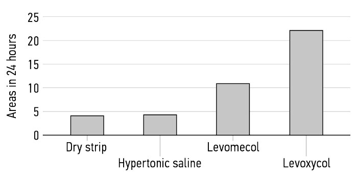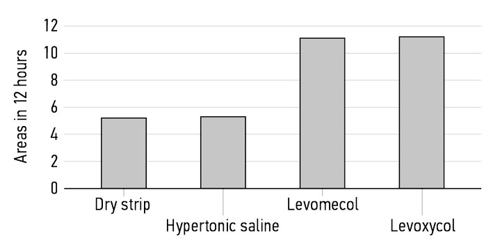 These results suggest that the Levoxycol composition, which contains Ximedon and is developed on a polypropylene oxide base, exhibits both longer temporal (up to 24 hours) and quantitative draining properties in comparison with Levomecol (up to 16 hours).
