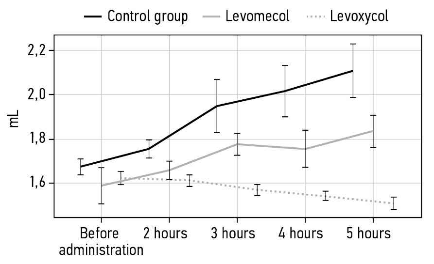 In all experimental groups, the liquid displacement volume was the same before carrageenin injection. When Levomecol was used before carrageenin injection, the displaced liquid indices were 1.65 ± 0.14 mL, whereas when carrageenin was administered starting from 3 hours, the amount was 1.8 ± 0.19 mL. When Levoxycol was applied before carrageenin injection, the displaced liquid values were 1.62 ± 0.13 mL, while when carrageenin was administered starting at 3 hours, they were 1.57 ± 0.16 mL (p = 0.013).