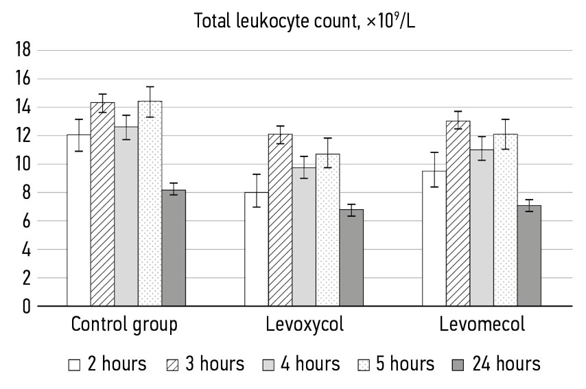 In both experimental groups, the administration of Levomecol and Levoxycol led to a notable restoration of ESR and C-reactive protein levels to reference values. At the 2-hour period, the ESR values were approximately equivalent for both experimental groups, averaging 0.8–1.5 and 0.5–1 mm/hour for Levomecol and Levoxycol, respectively. In the group where Levoxycol was administered, the ESR was 0 mm/hour at 3 hours and remained consistent with baseline values. In the Levomecol group, ESR was lower than in the control group throughout the observation period but did not reach baseline values (0 mm/hour) until after 5 hours.