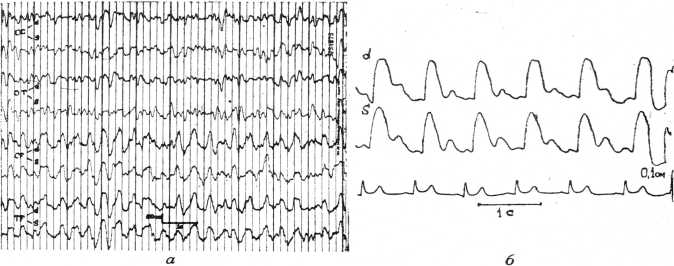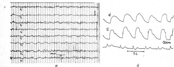 Рис. 2. а—ЭЭГ в фазе умеренной клинической декомпенсации; б—РЭГ в фазе умеренной клинической декомпенсаци