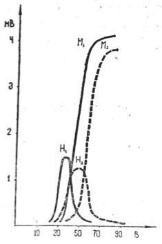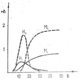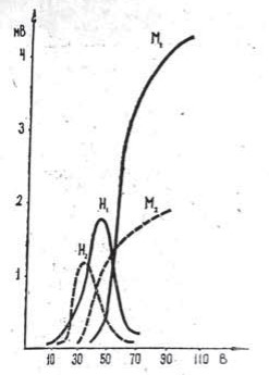 Рис. 1. График зависимости амплитуды Н- и. М-ответов от величины стимула. Больной И. Диагноз: резаная рана связок левого коленного сустава. Продолжительность иммобилизации 75 дней.