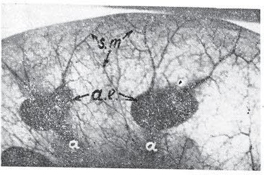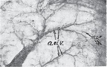 . На рис. 1 изображена бесконтрастная трансиллюминационная ангиограмма участка передней стенки поперечной ободочной кишки, расположенного между двумя отрезками прямых внутристеночных артерий и вен. От этих артерий по направлению к указанному сегменту отходят косопоперечно ветви, анастомозирующие со смежными ветвями того же сосуда, а также с ветйями, связанными с противолежащим сосудом. Возникает довольно густая подслизистая сеть. На приведенной ангиограмме определяются наслаивающиеся друг на друга сплетения субсерозного (s.s.), подслизистого (s.m.) слоев. Местами видны сосуды слизистой ,(т.). В формировании описываемой сосудистой сети подслизистого слоя помимо двух смежных прямых сосудов участвует и крупная ветвь (А), отходящая от прямой внутристеночной артерии и разделяющая этот промежуток на две части. Субсерозное сплетение также формируется ветвями интрамуральных прямых артерий. На бесконтрастной трансиллюминационной ангиограмме сигмовидной ободочной кишки (рис. 2) контурируются сосуды продольного мышечного слоя (m.s.). Дифференцируются, артерии и вены (a. et v.). Последние дают более интенсивные теневые изображения.