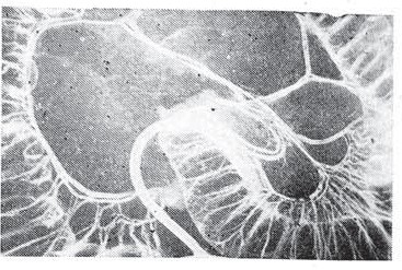 При рентгеноангиографии (рис. 4) отчетливо контрастируются экстраорганные сосуды, дифференцируются лишь крупные ветви подслизистого сплетения. Изображения ветвей, принадлежащих задней стенке кишки, наслаиваются на рисунок сосудов передней стенки. Дифференцировка артерий и вен неосуществима. Ни в одном случае на рентгеноангиограммах мы не получили изображения сосудов слизистой, продольного и циркулярного мышечного слоев. Следовательно, рентгеноангиография как с низкодисперсными контрастными веществами (кардиотраст, уротраст, билигност), так и с сернокислым барием непригодна для исследования сосудов слизистого и мышечного слоев.