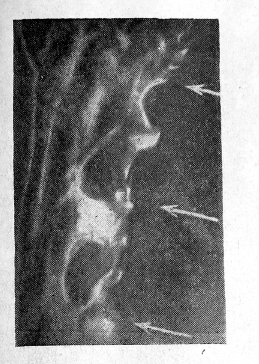 Рис.2. Двуконтрастная рентгенограмма той же больной, выполненная в положении лежа. Там, где была отмечена зубчатость большой кривизны, картина осталась стабильной. Между разрывами плавных очертаний большой кривизны стенка желудка деформирована, ригидна. Раковая опухоль желудка.