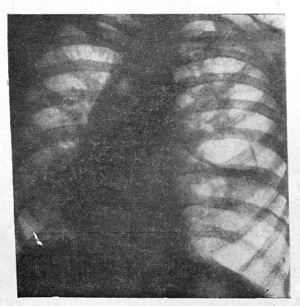 Рис. 1. Обзорная рентгенограмма больной К., 15 лет. Поликистоз левого легкого с клапанным механизмом, органы средостения резко смещены вправо.