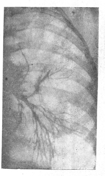 Рис. 2. Левосторонняя бронхограмма той же больной. Кисты не дренированы, полости их огибаются деформированными бронхами.