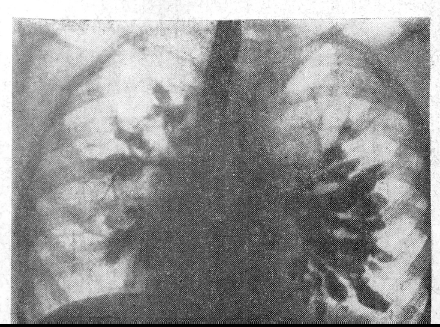Рис.3. Двухсторонняя одномоментная бронхограмма больного Г., 8 лет. Тотальный поликистоз обоих легких. Обзорное рентгенологическое исследование характерных признаков поликистоза не выявило.