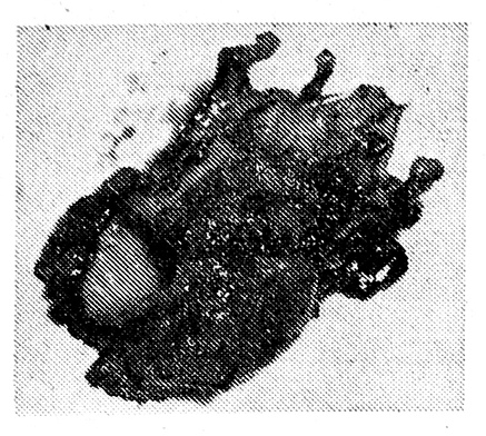 На операции после Т-образного рассечения кожи шеи, вскрытия передней поверхности гортани и трахеи обнаружено резкое увеличение обеих долей и перешейка щитовидной железы, ткань которой во всех отделах представляла конгломерат мелких плотных узлов. Щитовидная железа была спаяна с гортанью, что могло означать прорастание опухоли гортани в щитовидную железу. Однако срочное гистологическое исследование кусочков щитовидной железы из области перешейка и правой доли, взятых во время операции, опровергло это предположение. В препаратах тканей из щитовидной железы имелась аденокарцинома с участками фиброза и тиреоидита. Кроме этого, во время операции были обнаружены множественные лимфатические узлы в предгортанной клетчатке размерами с горошину. В связи с констатацией поражения не только гортани, но и щитовидной железы злокачественной опухолью другого гистологического строения тактика хирургической операции была изменена. Выполнены ларингэктомия и тиреоидэктомия, одномоментно были удалены два органа единым блоком и две злокачественные опухоли разного гистологического строения. Общий вид удаленных тканей представлен на рисунке. Вслед за этим произведены пластика глотки, формирование постоянной трахеостомы, ушивание кожной раны.