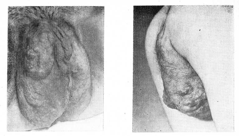 В области больших половых губ имеется большая сосудистая опухоль, представляющая конгломерат варикозно расширенных вен, образующих кавернозные полости, стенки которых резко истончены. Опухоль бугриста, мягко-эластической консистенции, сине-багрового цвета, легко сжимается, но тотчас по прекращении на нее давления принимает первоначальную величину. В вертикальном положении беременной опухоль сильно увеличивается, мешает при ходьбе, вызывает чувство тяжести и боли в этой области; сзади она напоминает мошонку мужчины (рис. 1- Варикоз вульвы во время беременности (вид спереди) и 2-).