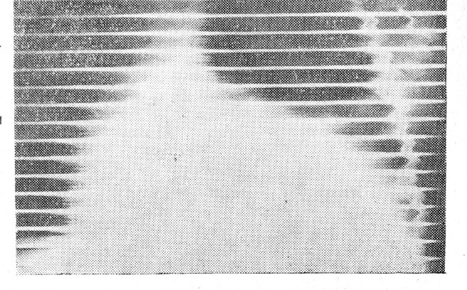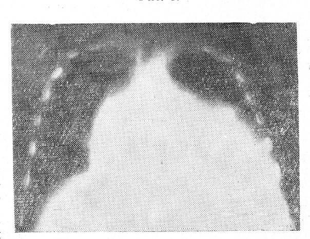 На рентгенокимограмме определяются справа глубокие заостренные двухвершинные зубцы. Слева у верхнего контура одновершинные зубцы с весьма глубокой амплитудой, которые постепенно уменьшаются по направлению к верхушке. В области аорты заостренные копьевидные зубцы (рис. 1).