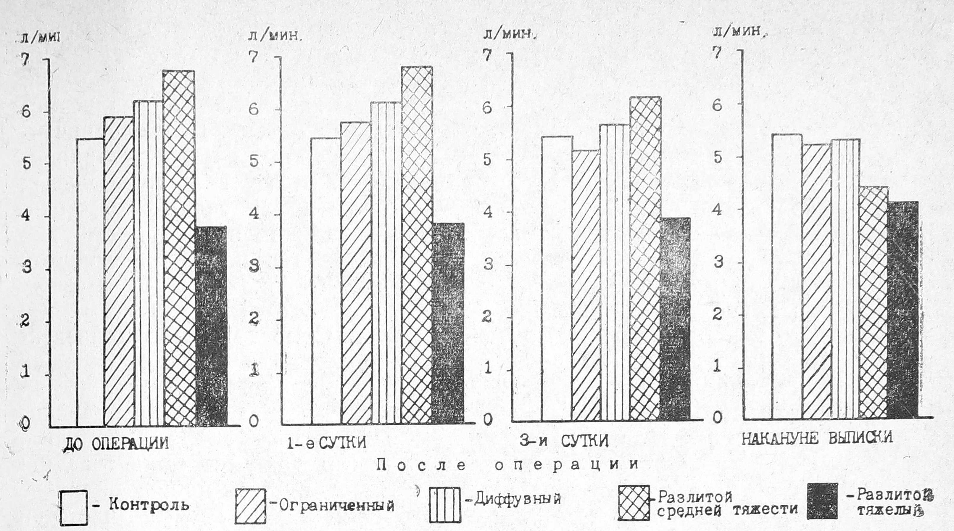 - Уровень минутного объема крови наиболее высок у больных распространенными формами воспаления брюшины в течение первых трех суток послеоперационного периода. У тяжело больных разлитым перитонитом, несмотря на интенсивную инфузионную терапию, минутный объем сохраняется на низком уровне как в до-, так и в послеоперационном периодах.