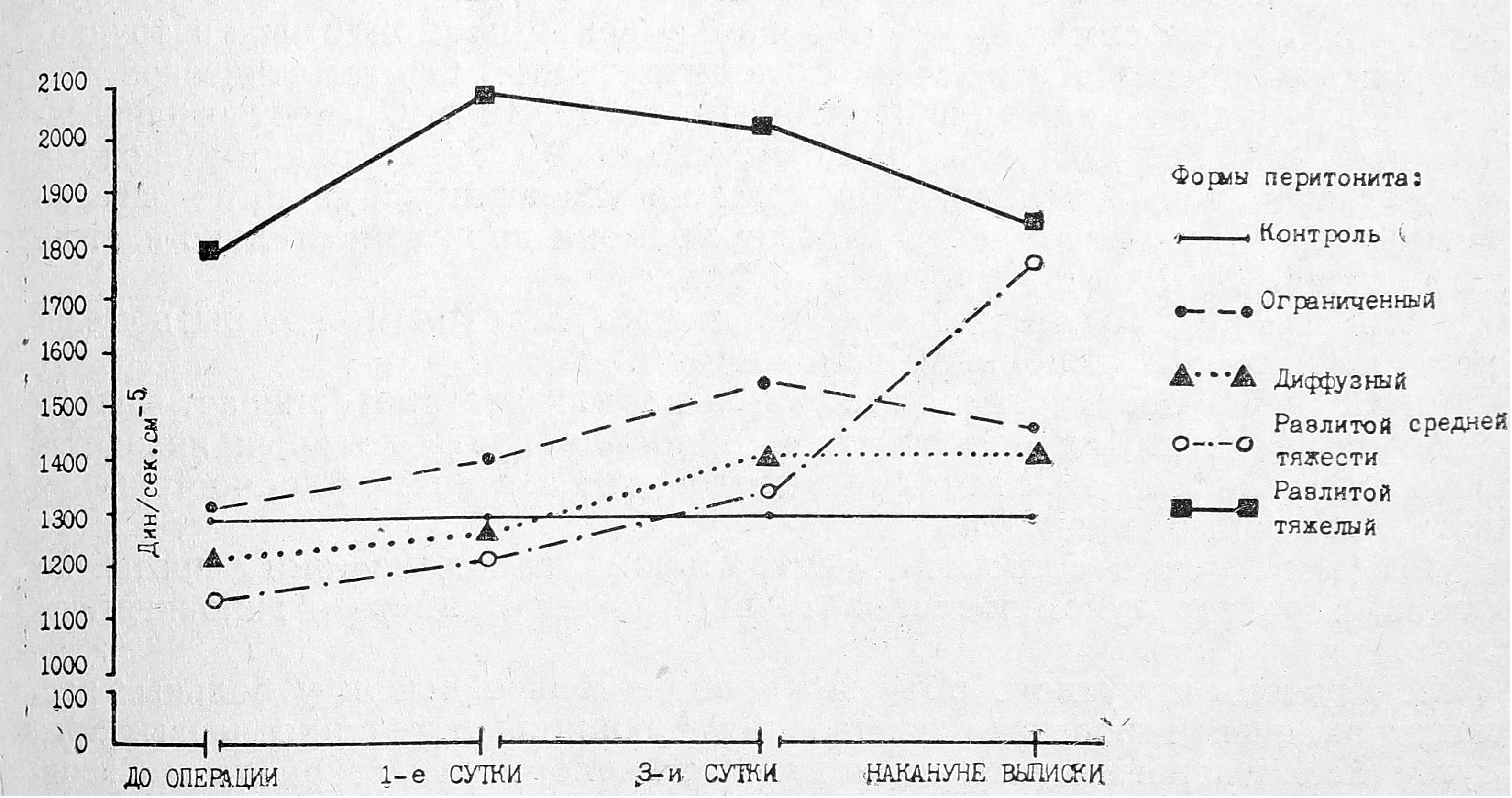 Рис. 2 иллюстрирует динамику общего периферического сопротивления сосудов. Анализ этого показателя выявляет разнообразие ответных реакций в зависимости от клинической формы перитонита. У больных с ограниченным и диффузным воспалением при госпитализации и в раннем послеоперационном периоде изменения сосудистой резистентности были статистически недостоверными. Некоторое усиление констрикторной реакции, не превышавшее 19,2% по отношению к здоровым, наблюдалось на 3-и сутки после операции. В периоде клинического выздоровления происходило ослабление вазоконстрикции. Небольшое, но достоверное снижение ОПС на первых двух сроках определения у больных среднетяжелой формой разлитого перитонита сменялось высокими цифрами в периоде выздоровления. Среднее содержание его равнялось 1768 ± 10,7 дин/сек. см-5, что на 37% превышает контрольный уровень.