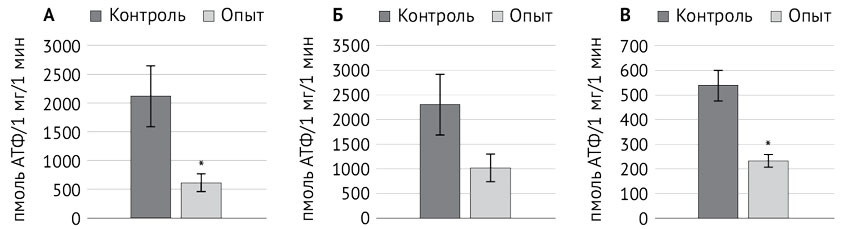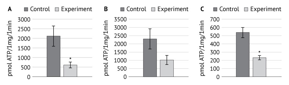 Fig. 2. Ectonucleotidase activity in the urogenital system of 9-month-old rats in a valproate model of autism. Data are presented as M ± m. A. Seminal duct: control (n = 15), experiment (n = 10), *p = 0.040. B. Bladder: control (n = 19), experiment (n = 12), p = 0.274. C. Uterus: control (n = 6), experience (n = 19), *p = 0.010 compared to the control group