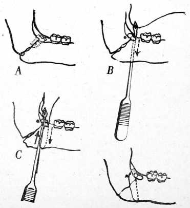 Под мандибулярной и инфильтрационной анестезией и премедикацией проводили разрез слизистой переходной складки по переднему краю ведви, отслаивали слизисто-надкостничную ткань и отводили ее крючками для обнажения переднего края ветви и наружной косой линии. В участке перехода в наружную косую линию при помощи бормашины просверливали сквозное костное отверстие. Специальную иглу проводили через кожные покровы подчелюстной области (рис. 1, В) между мягкими тканями по внутренней поверхности нижней челюсти на уровне линии перелома у кпереди от нее и выводили в полость рта, а затем вставляли в нее бронзово-алюми- ниевую или танталовую проволоку (рис. 1, С). Проволокой вслепую охватывали большой фрагмент нижней челюсти, иглу выводили на наружную поверхность челюсти непосредственно в рану на уровне внутреннего конца проволоки. Внутренний конец проволоки вводили в отверстие малого фрагмента и концы костного шва соединяли на щечной поверхности после репозиции отломков. Вследствие этого большой фрагмент оказывается подвешенным к малому фрагменту нижней челюсти. Слизисто-надкостничную ткань укладывали на место. Рану ушивали наглухо с введением дренажа на 24 часа. В послеоперационном периоде наблюдался умеренный отек мягких тканей. В течение недели мы проводили курс антибиотикотерапии.