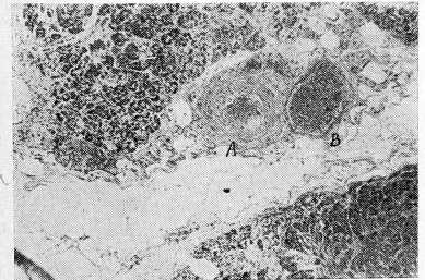 Облитерация внутриорганной артерии атеросклеротической бляшкой с тромбом. Окраска гематоксилин-эозином. ×63, А — артерия, В — вена.
