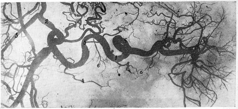 1 — селезеночная артерия, 2 — общая печеночная артерия, 3 — желудочно двенадцатиперстнокишечная артерия, 4 — поджелудочные ветви селезеночной артерии, 5 — места положения атеросклеротических бляшек, 6 — «ампутация» сосуда.