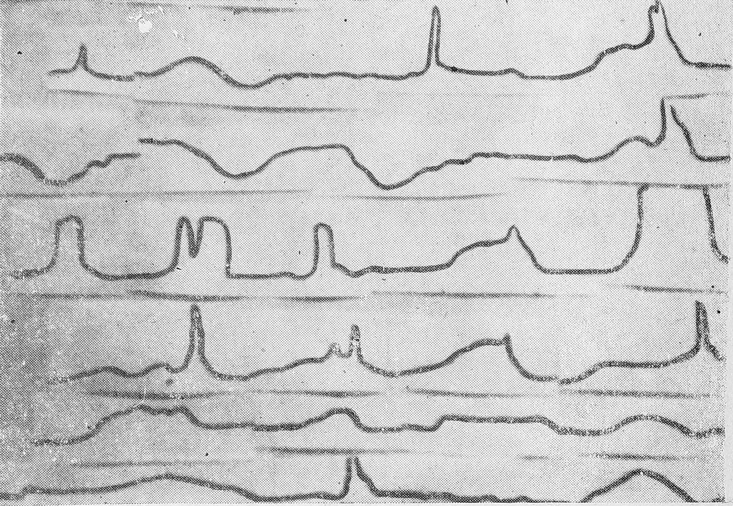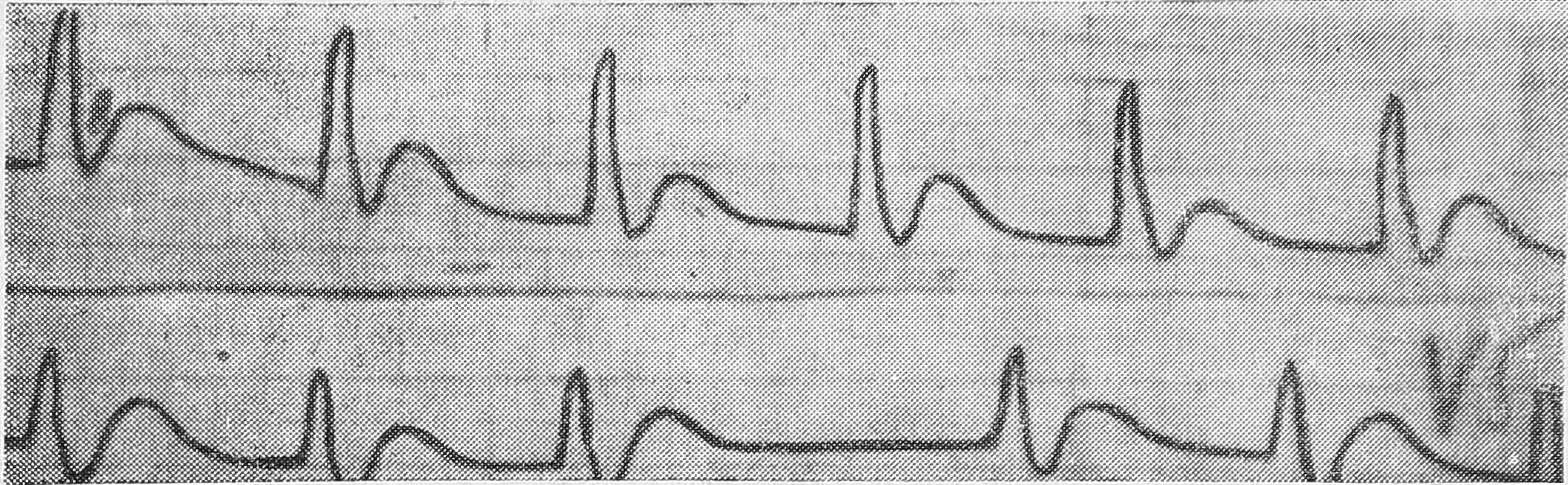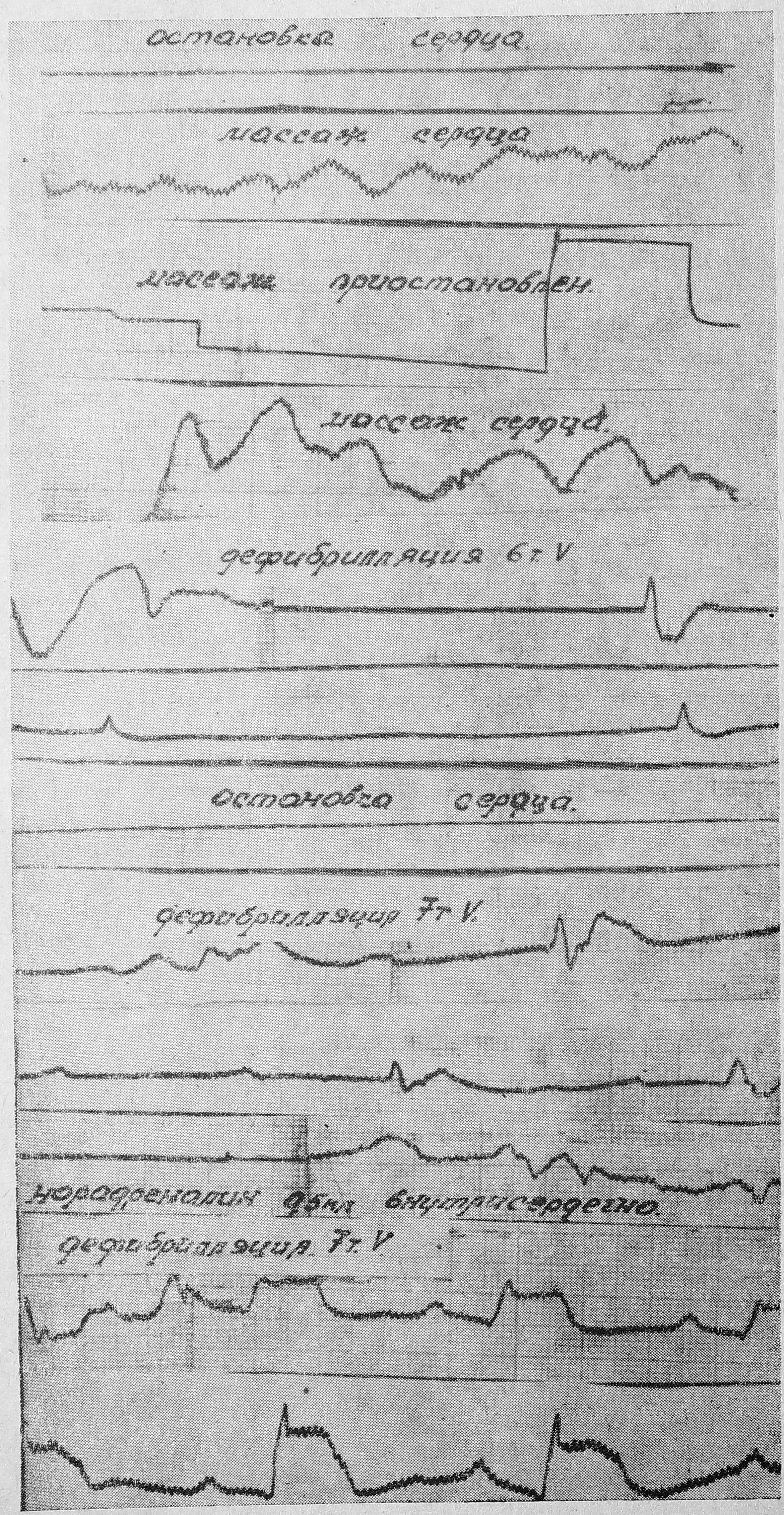 У 2 больных с первоначально зафиксированным мерцанием (у 1 мелковолновым и у 1 крупноволновым) сразу после дефибрилляции наступила остановка сердца. После массажа у одной из этих больных вновь возникла фибрилляция желудочков (электрический разряд вызывал повторную остановку сердца), а у другой появились единичные желудочковые комплексы. У третьей больной, у которой вначале отмечена была остановка сердца и только массаж вызывал появление мерцания желудочков, вслед за электрическим разрядом вновь наступала остановка сердца. Последующий массаж привел к возникновению колебаний ЭКГ с четко дифференцируемыми частыми (90 в мин.), уширенными (0,20 сек.) желудочковыми комплексами, после чего на фоне массажа наступило мерцание желудочков, а повторная электроимпульсная терапия приводила к остановке сердца.