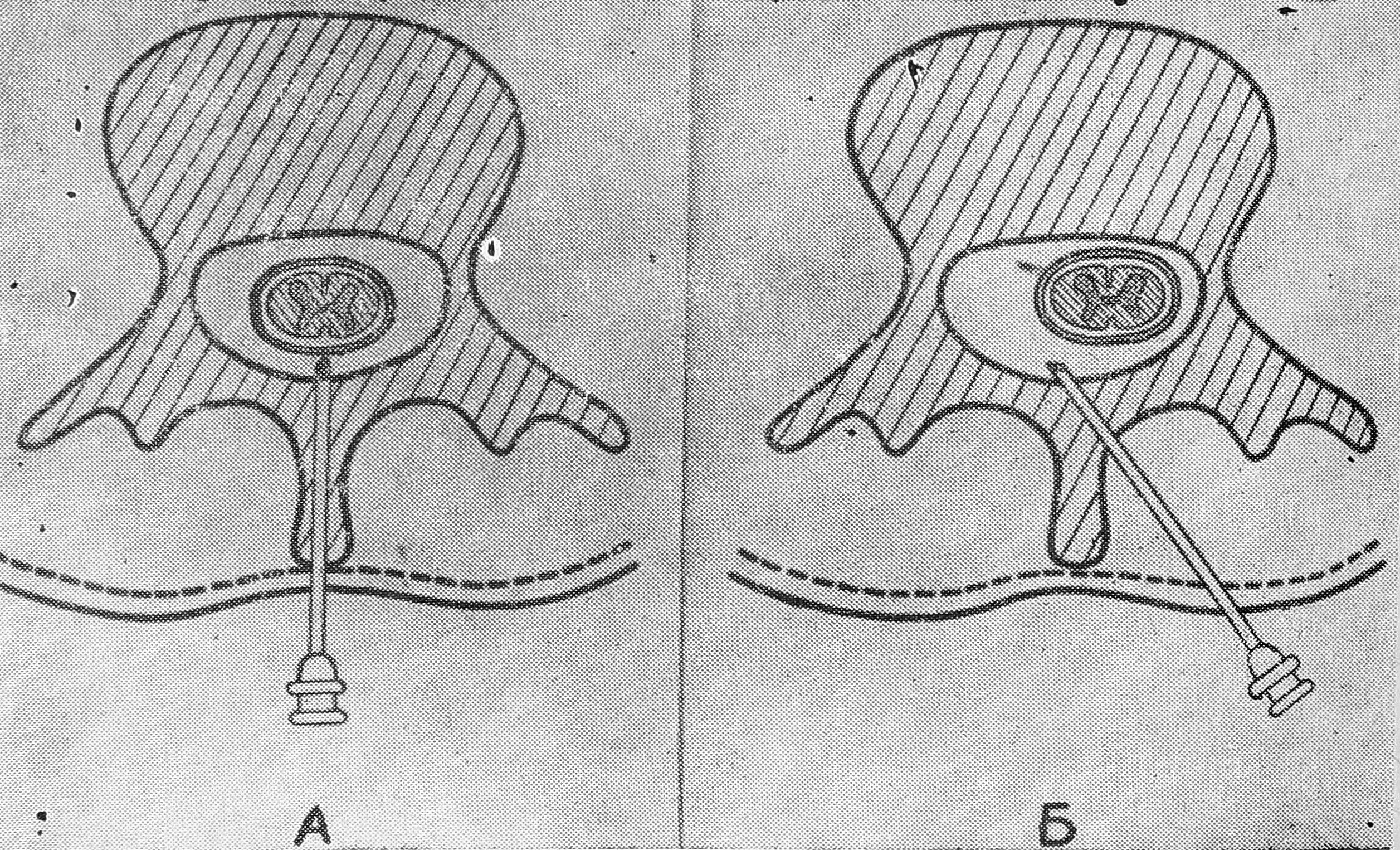 При введении иглы ее следует держать так, чтобы скос ее концевого среза был обращен в сторону твердой мозговой оболочки. Этим уменьшается возможность «зацепить» дуральный мешок кончиком иглы при ее продвижении.
