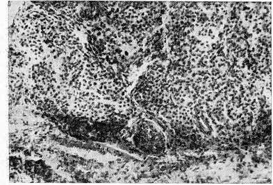 Рис. 1. Щитовидная железа крысы, получавшей добавку 0,003 мкг/г хрома к рациону в течение 18 месяцев. Объяснение в тексте. × 200.