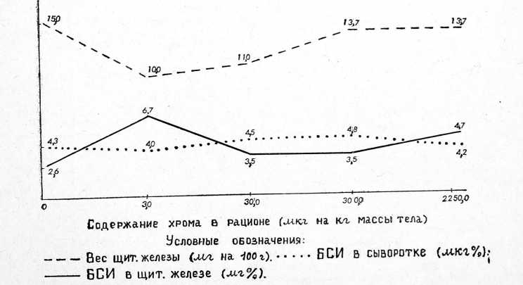 Рис. 2. Зависимость между суточной дозой хрома в рационе, весом щитовидной железы и уровнем белковосвязанного йода в ней и в сыворотке крови.