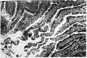При повышенных добавках хрома в рацион (0,03—2,5 мкг/г) в щитовидной железе происходит лимфоидная инфильтрация и склероз стромы, фибриноидное набухание и склероз кровеносных сосудов — проявления и исход гиперчувствительности замедленного типа. Кроме того, при этих дозах хрома в первом физиологическом барьере — в слизистой желудка и кишечника — обнаруживаются признаки дегенерации и сенсибилизации: отек стромы, нарушение целостности ворсинок, круглоклеточная инфильтрация (рис. 3).