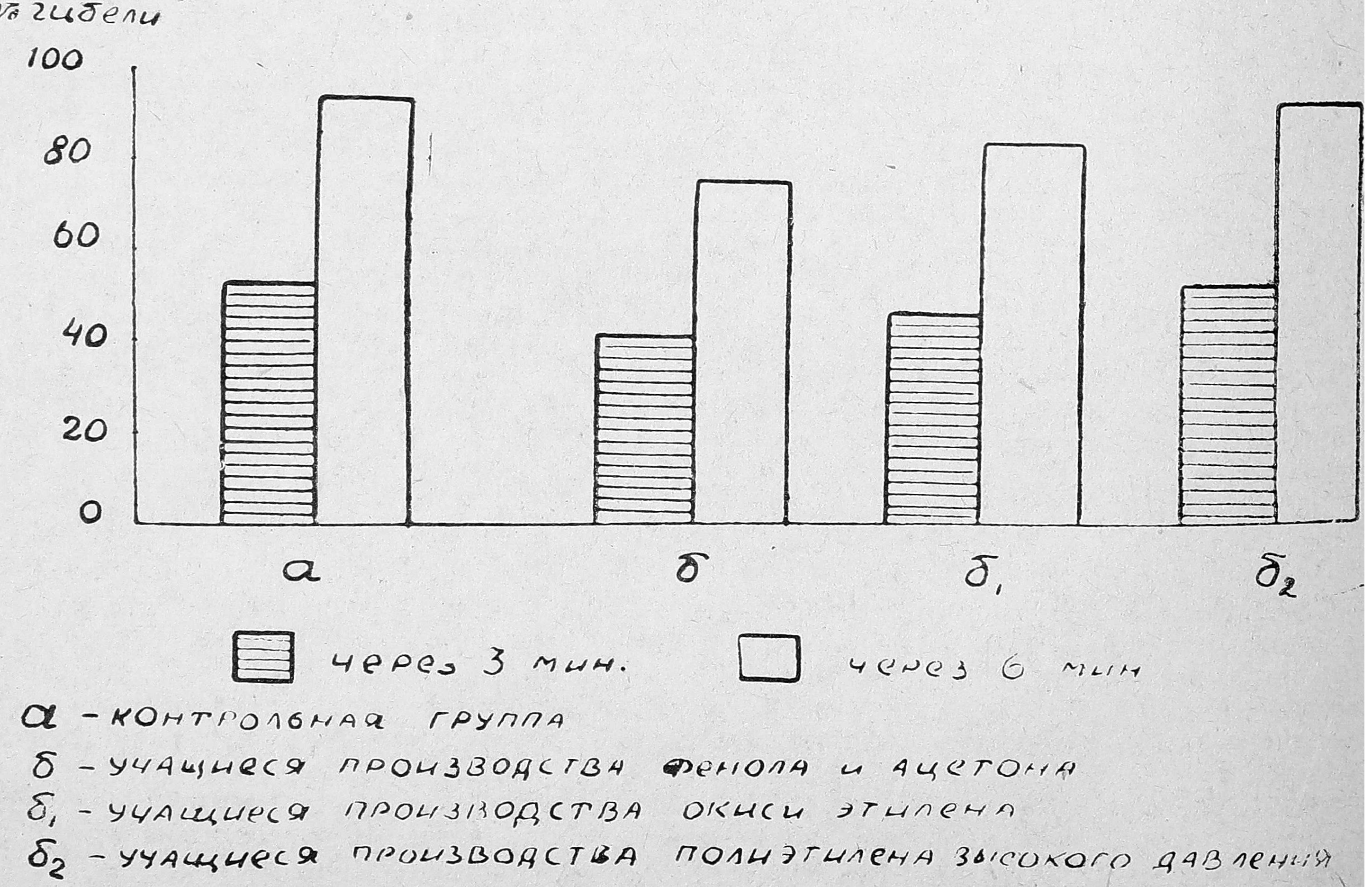 В программе подготовки аппаратчиков 65% времени отводится производственной практике. В первые 6—7 месяцев прохождение производственной практики на заводе сопряжено с воздействием на организм учащихся непредельных углеводородов, а во время сплошной практики (последние 3 месяца) — непредельных углеводородов, паров, бензола, изопропилбензола, окиси этилена, фенола, альфаметилстирола, ацетона и других. Концентрации этих веществ, как правило, были не выше предельно допустимых уровней (кроме окиси этилена, в отдельных случаях превышавшей их в 1,5—2 раза). Показатели микроклимата в основном соответствовали санитарно-гигиеническим нормам.