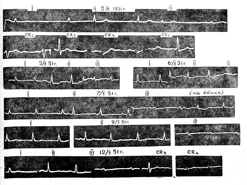 Изменения ЭКГ, которые мы наблюдали у больных под влиянием торакальных операций, появляются с первого дня после таковой и исчезают, чаще всего, к концу первой недели или на второй неделе. Следовательно, операция вызывает временные, функциональные нарушения со стороны сердца. Сам же характер ЭКГ-изменений свидетельствует о нарушении обменных процессов в миокарде, связанных, по-видимому, с трофическими расстройствами, а также заставляет предполагать рефлекторные влияния на коронарные сосуды.