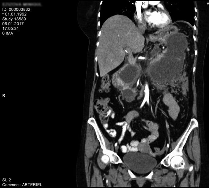 Методы визуализации при ХП. КТ считают лучшим методом для первичной визуализации при обследовании по поводу ХП [19]. Преимущества КТ заключаются в том, что она широкодоступна, демонстрирует подробный обзор изменений морфологии поджелудочной железы, возникающих при ХП, и особенно полезна для выявления изменений, наблюдаемых при осложнениях болезни. КТ быстро оценивает патологию соседних органов, внося ясность в отношении различных проявлений, имитирующих ХП. Ещё одно преимущество КТ — её способность обнаруживать различные осложнения острого панкреатита и ХП, такие как псевдокисты (рис. 1), непроходимость жёлчных путей или двенадцатиперстной кишки, венозный тромбоз, псевдоаневризмы и панкреатико-плевральные свищи [9].